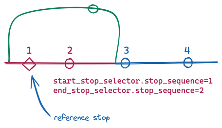 start_stop_selector | StopSelector | 必須 | 1つ | この変更の影響を受ける元の便の最初の停留所等(stop)を指定する stop selector。end_stop_selector と組み合わせて使用されます。start_stop_selector は必須であり、travel_time_to_stop と共に使用される基準停留所等(stop)を定義します。詳細は travel_time_to_stop を参照してください。 |