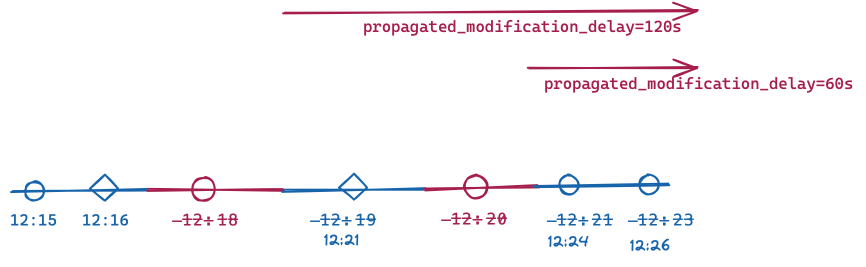 迂回による遅延は、変更の終了後のすべての停留所等(stop)に影響します。1つの便に複数の変更がある場合、遅延は累積されます。