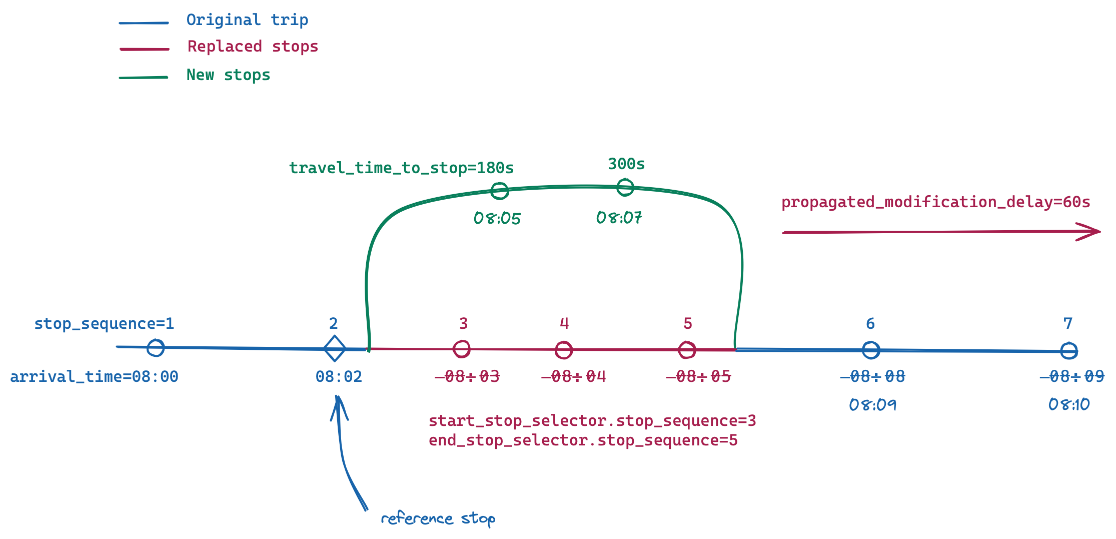 もし変更が便(trip)の最初の停留所等(stop)に影響する場合、その停留所等(stop)は変更の基準停留所等(reference stop)としても扱われます。