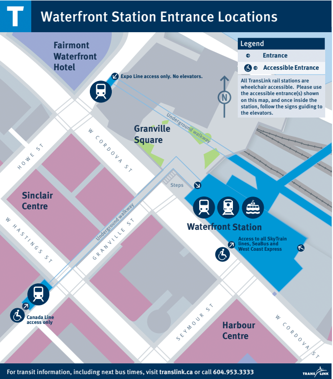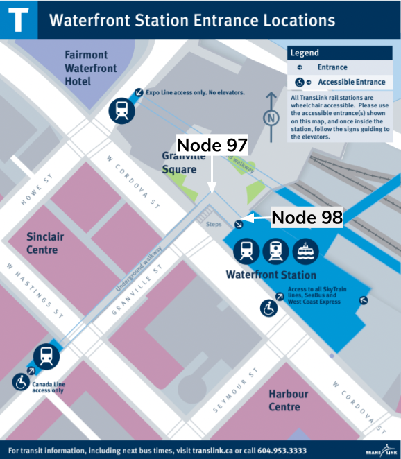 Granville Street にある Waterfront Station の入口には、エレベーター、エスカレーター、階段があります。これらの入口は stops.txt においてノードとして定義されています。駅の内部区画と入口を接続するためには、Waterfront Station の parent_station