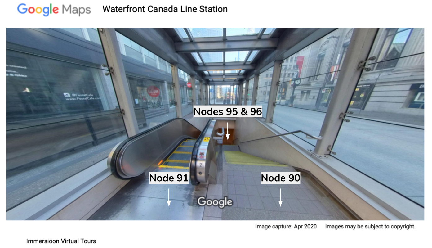 さらに、下図に示すように、Granville street の階段、エスカレーター、エレベーターの下部を駅本館に接続する地下通路があります。そのため、通路区間を定義するために追加で2つのノードが作成されます。
